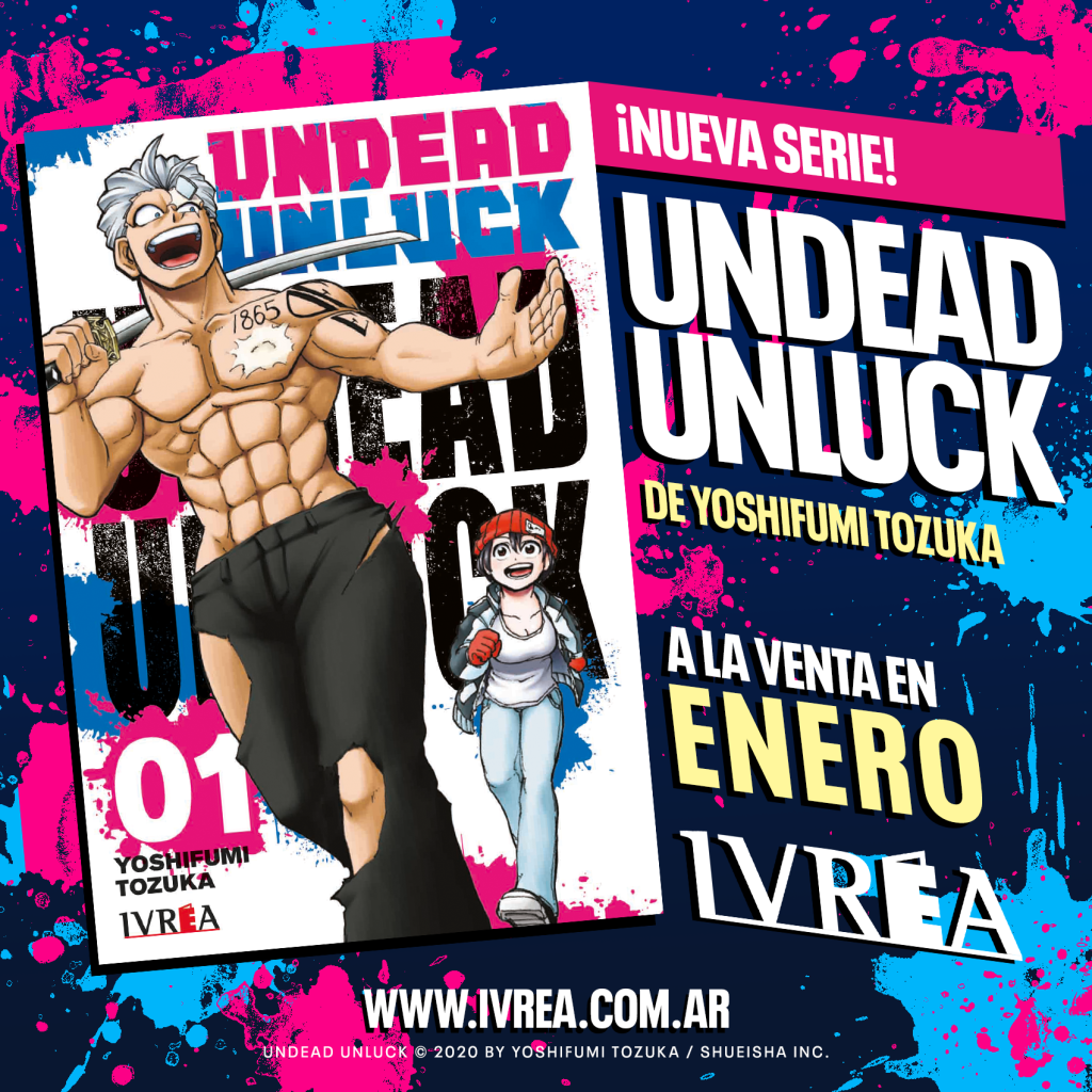 Undead Unluck se publica desde principios de 2020 en las páginas del prestigioso semanario Shonen Jump de la editorial Shueisha, compilando al día de hoy 23 tomos. En 2023, Su gran popularidad la ha llevado a recibir una adaptación animada de 24 capítulos que, actualmente, forma parte del catálogo de la plataforma de streaming Disney+. Nuestra edición de la obra será idéntica a la original japonesa: tomos formato tankoubon con sobrecubierta. El primer volumen de la serie ya se encuentra en imprenta y estará saliendo en las primeras semanas del mes de enero.