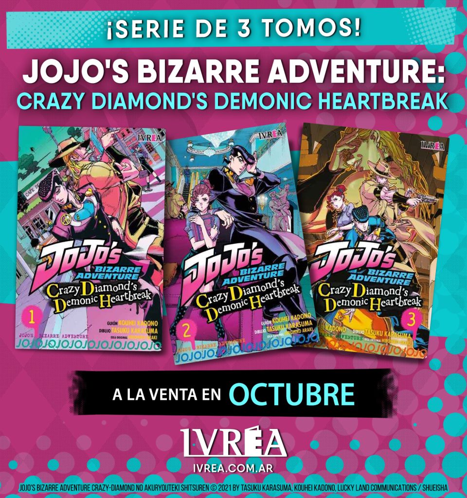 Los capítulos de Crazy Diamond’s Demonic Heartbreak se publicaron entre fines de 2021 y mediados de 2023 en la revista Ultra Jump de la editorial Shueisha, y luego fueron recopilados en 3 tomos. El guion estuvo a cargo de Kouhei Kadono, autor también de la novela Purple Haze Feedback, mientras que el dibujo es de Tasuku Karasuma, reconocido por su trabajo en No Guns Life. Nuestra edición será en tomos en formato B6 con sobrecubierta. Vas a poder conseguir el primero en comiquerías de todo el país en el transcurso de octubre.